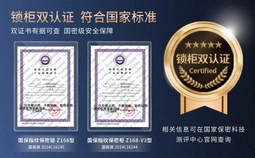 一個(gè)合格的保密柜必須通過國家保密科技測評中心檢測,符合國家保密標(biāo)準(zhǔn)BMB54-2020《安全保密產(chǎn)品 保密柜安全保密技術(shù)要求》,獲得保密證書。而存放國家涉密載體的保密柜須獲得鎖柜雙認(rèn)證證書。